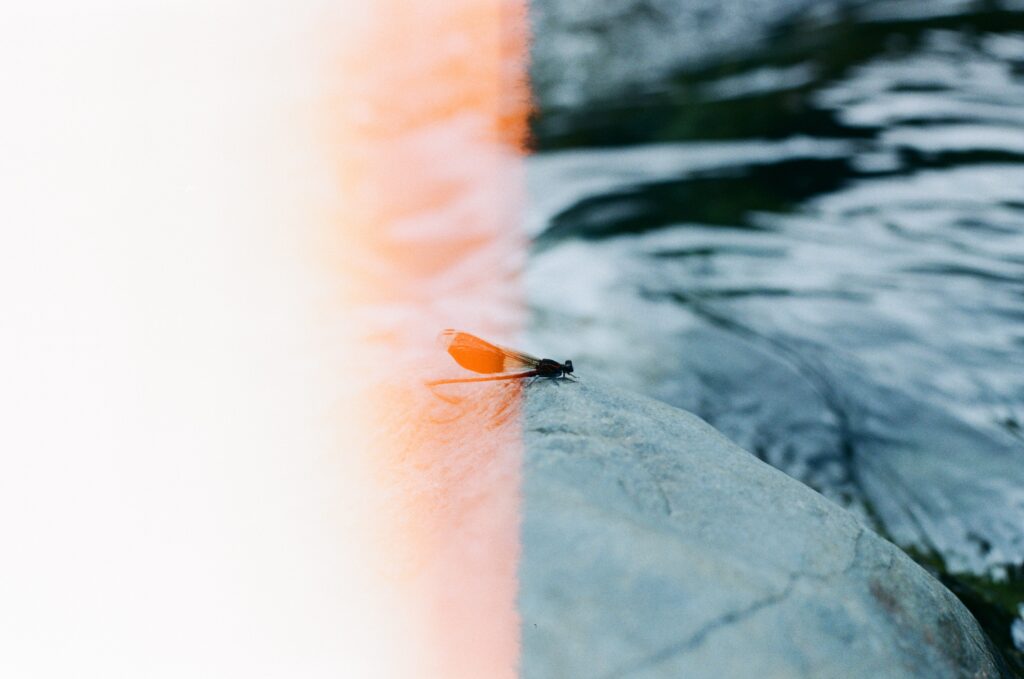 有一隻豆娘靜靜停在一顆石頭上